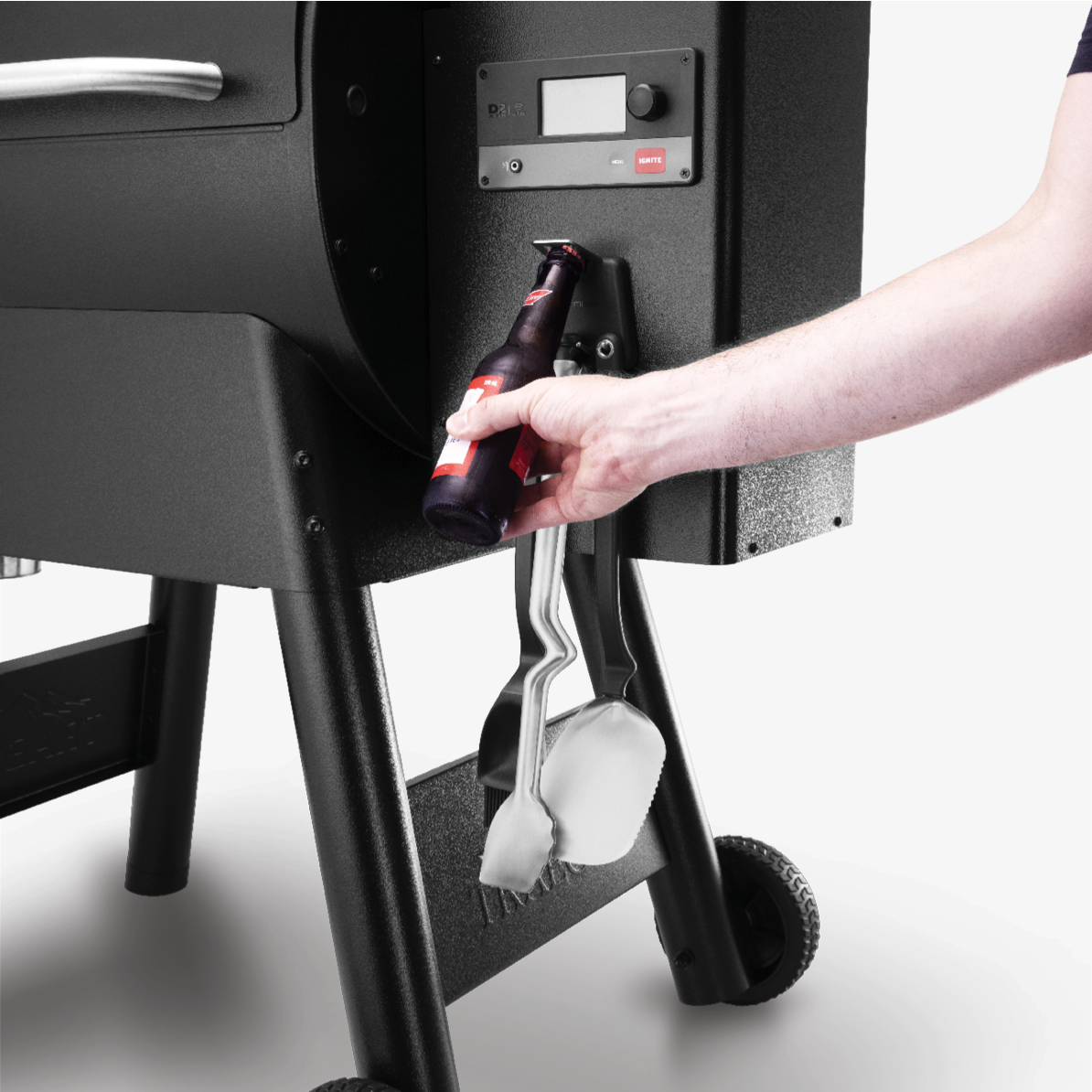 Tongs that open or lock closed with the click of a button, prick sausages, scrape, and sit up off your bench.